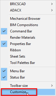 To do this, fire up Bricscad and right click somewhere in the toolbar area until you get the context menu with the option 'Customise...' at the bottom and select it.