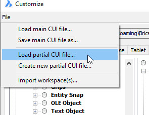 Now, at the top menu of this dialog select File -> Load Partial CUI file... and browse to C:\ADACX\Support and select the ADACX-BCAD.cui file and it will load the new toolbar and menu items.